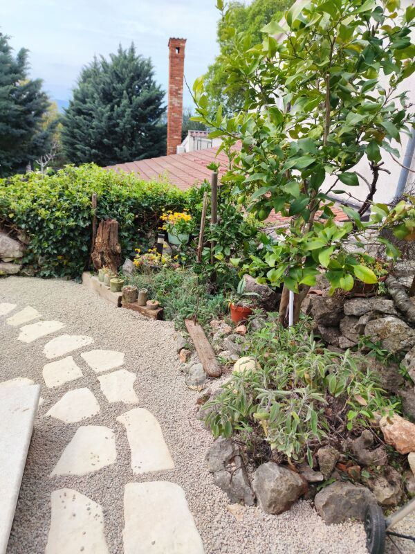 Vom ca. 100 qm2 grossen mediterranen Garten hat man ausreichend Platz für Sitzgelegenheiten und Liegestühle.